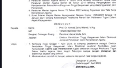 JAKARTA, KenNews.id – Menteri Agama RI, Yaqut Cholil Qoumas, menunjuk Direktur Pendidikan Tinggi Keagamaan Islam pada Direktorat Jenderal Pendidikan Islam Kementerian Agama (Kemenag) RI, Prof Ahmad Zainul Hamdi, sebagai pelaksana tugas (Pemberitaan sebelumnya tertulis Pj) Rektor Institut Agama IsIam Negeri (IAIN) Takengon.