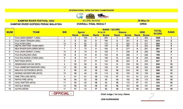 Hasil Kejuaraan International Open Rafting Championship di Kampar Malaysia 2024. Foto: Fb Khalis