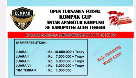 Pelaksana Tugas (Plt) Ketua DPC APDESI Aceh Tengah, Idrus Saputra, mengatakan Turnamen Futsal KOMPAK CUP ditujukan sebagai ajang silaturahmi antara aparatur kampung se Kabupaten Aceh Tengah dan menumbuhkan semangat berolahraga dan menimbulkan jiwa kompetisi bagi Aparatur Desa.