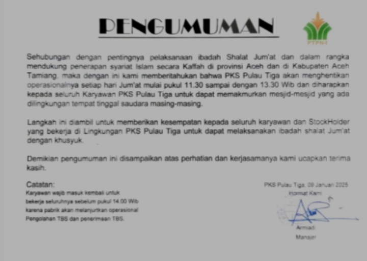 Pengumuman “Sehubungan Dengan Pentingnya pelaksanaan ibadah sholat jum’at dan dalam rangka mendukung pelaksanaan syari’at Islam kaffah di Aceh dan Aceh Tamiang maka dengan ini kami beritahukan bahwa PKS Pulau Tiga akan menghentikan operasionalnya setiap hari jum’at mulai pukul 11.30 sampai dengan 13.30 Wib dan diharapkan kepada karyawan untuk dapat memakmurkan masjid-masjid yang ada di lingkungan saudara masing-masing”