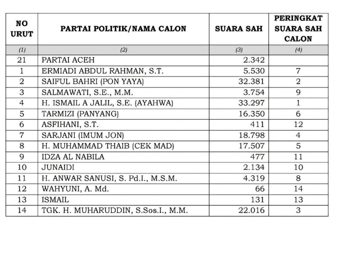 Dalam hal ini publik tahu bahwa perolehan suara terbanyak yang tidak lolos menjadi anggota DPRA dalam Pilleg 2024 adalah H. Muhammad Thaib dengan perolehan suara 17.507 disusul Tarmizi Panyang 16.359 suara yang kemudian ia maju sabagai wakil Bupati.