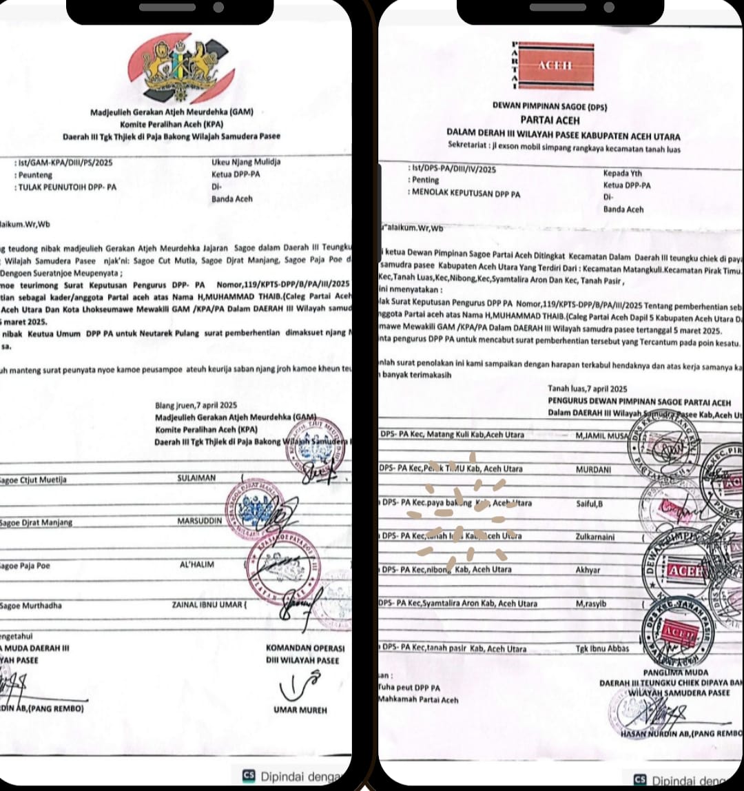 Dalam surat tertanggal 7 April 2025 dengan Nomor Ist/DPS-PA/DIII/IV/2025 bersifat penting itu ada dua poin yang disampaikan yaitu “Menolak Surat Keputusan Pengurus DPP PA Nomor 119/KPTS-DPP/B/PA/III2025 tentang pemberhentian sebagai kader/anggota Partai Aceh atas nama H.Muhammad Thaib ( Caleg Dapil 5 daerah pemilihan Aceh Utara dan Kota Lhokseumawe mewakili GAM/KPA/PA Daerah III Wilayah Samudra Pase tertanggal 5 maret 2025”.