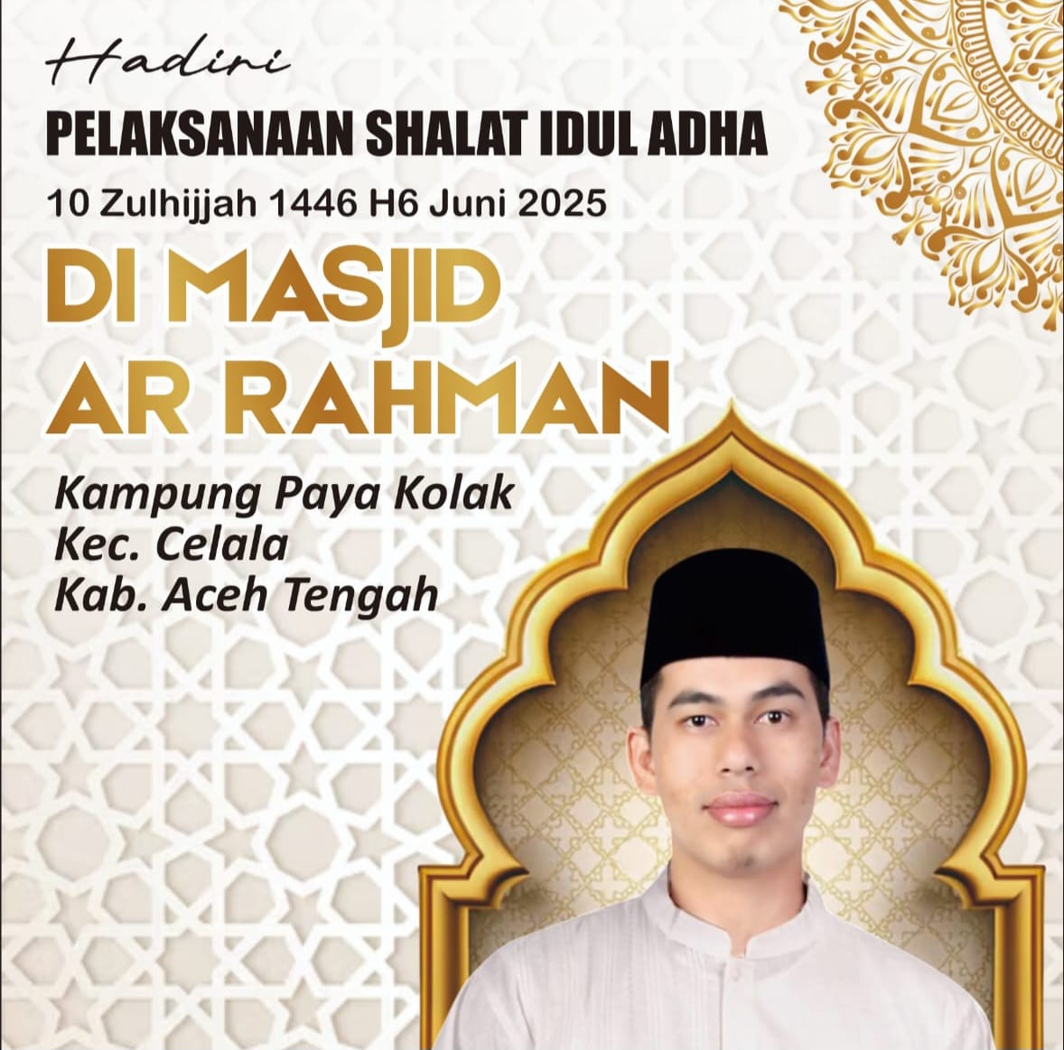 TAKENGON, KenNews.id – Pelaksanaan shalat Idul Adha, 10 Zulhijjah 1446 H bertepatan Jumat 6 Juni 2025 M. Di halaman masjid Ar Rahmah Kampung Paya Kolak Kecamatan Celala Kabupaten Aceh Tengah. Menghadirkan khatib Bardan Sahidi. Hal ini disampaikan panitia shalat Idul Adha Sahman. Kamis (5/6) 2025.