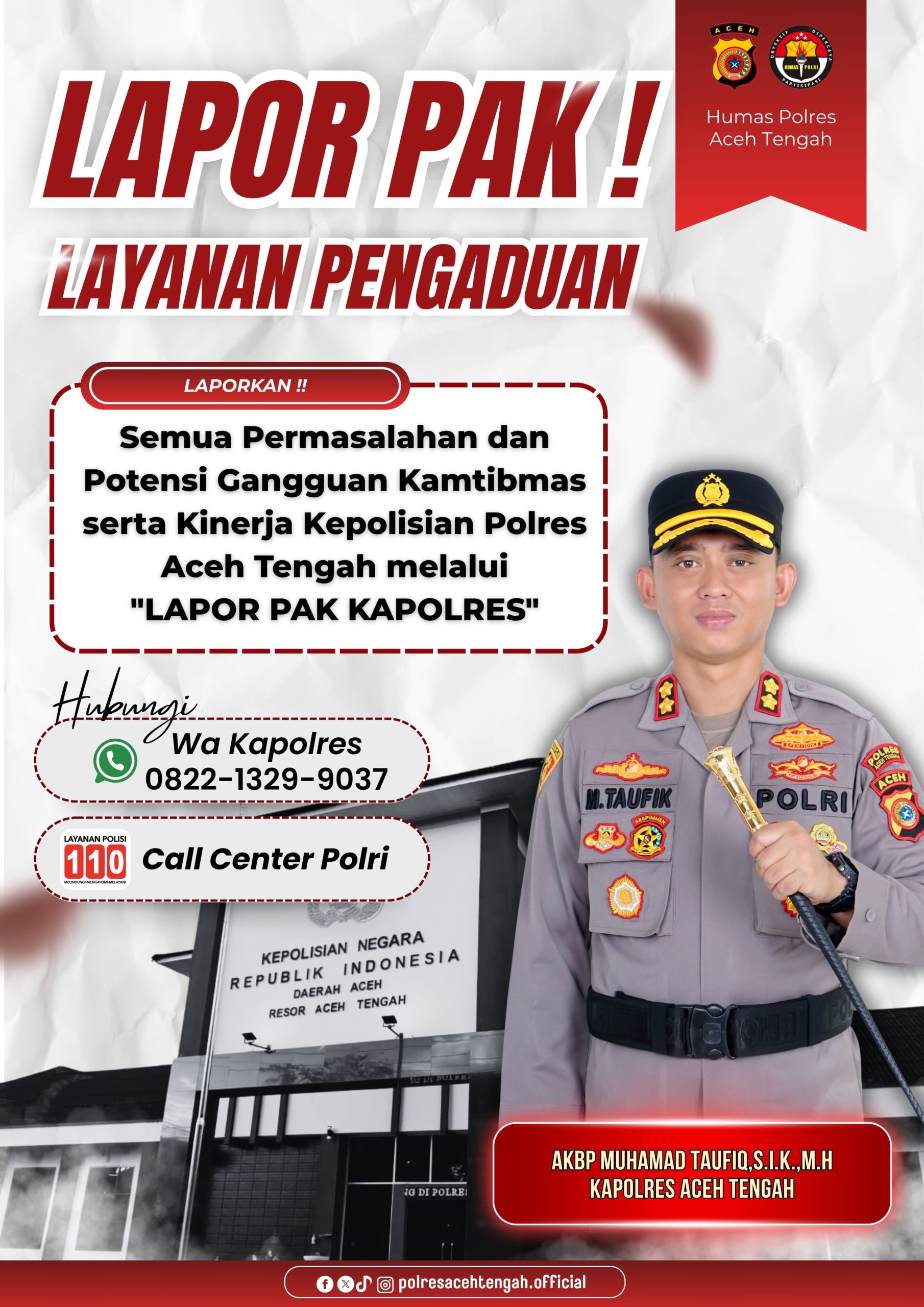 Melalui nomor WhatsApp 0852-9838-2007, masyarakat kini dapat menyampaikan berbagai laporan, keluhan, hingga aspirasi secara langsung kepada Kapolres maupun jajaran Polres Aceh Tengah.